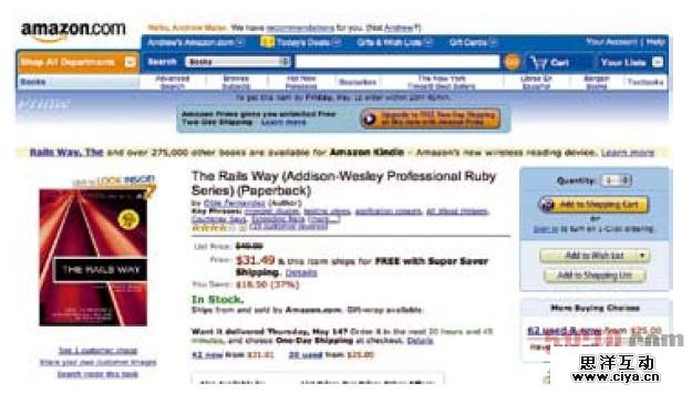 亚马逊网站允许你把要购买的东西放入“购物车”(shopping cart), 但实际上它仅仅是公司数据库中的项目列表。亚马逊为什么这样做? 因为对于复杂的技术细节而言,购物车是一个很方便的象征物,它可以在你 浏览网站的时候保存你购物的列表。当然如果你浏览的是Amazon.co.uk, 它会被写成“购物筐”(shopping basket)。 |