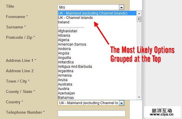 以UI中最常见的下拉菜单为例,选择注册表中的国家项。 多数网站开发人员和内容设计者会发现,某些国家被选中的机率为80%。