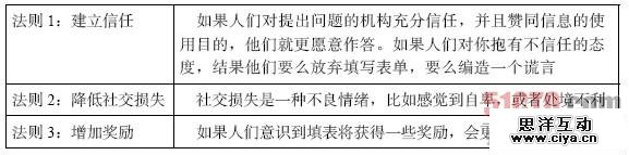 我们遵循源自“社会交换论”的三条法则来说服人们回答问题。“社会交换论”的核心理念是:人们只会回答那些让他们感觉良好的问题。
