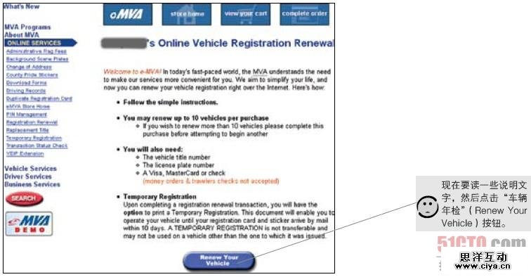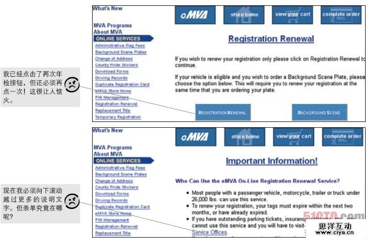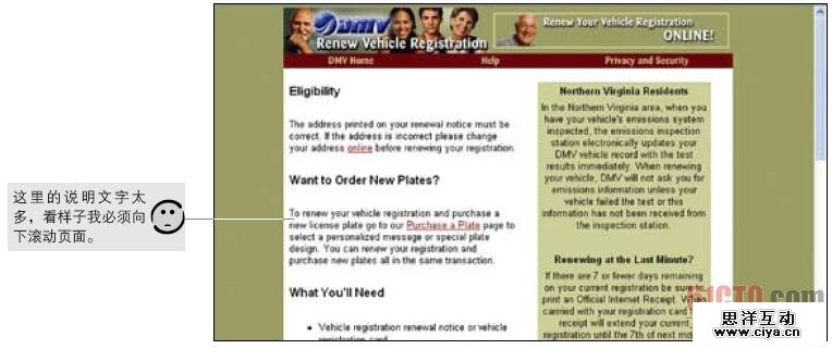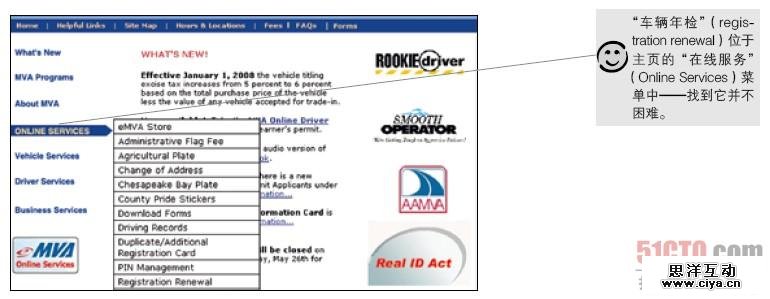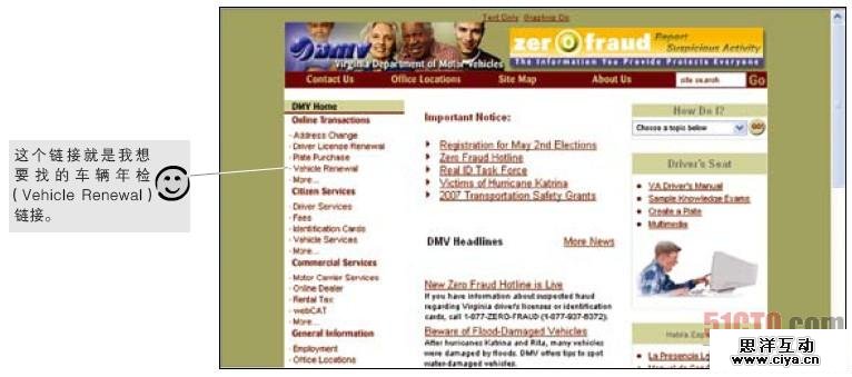在必要时为用户提供合适的表单在某种意义上就是一种简易的奖励。我们来对比一下弗吉尼亚州和附近另一个州车辆年检的流程。先从每个州交通部门的网站主页开始,让我们看看弗吉尼亚州的网站。