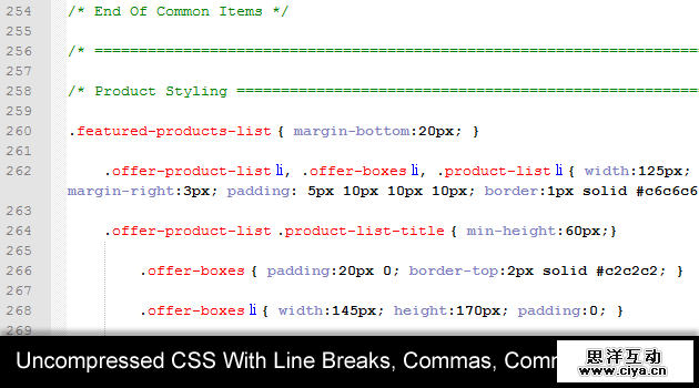 虽然Page Speed 在其压缩器内有一个相关设置,但笔者最喜欢这个网站里的:http://www.csscompressor.com/