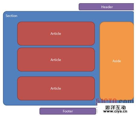 HTML 5的主要新元素包括:Header、Footer、Section、Article和Aside。当用户设计一个页面时,能够直观地在屏幕不同部分放置内容。示例页面图如下: