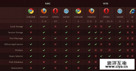 需要指出的是,即使同一个浏览器的同一个版本,在Mac和Windows两个平台,它们对CSS 3和HTML 5的支持也并不一致。本文是一份Chrome,Safari,Firefox,Opera,IE这5大浏览器,在Mac和Windows两个平台,对CSS 3和HTML 5各种功能的详细支持情况清单。