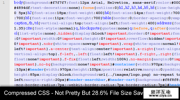 CSS(层叠样式表,使你网站美观的文件)经常被忽视。任何合理的网站,CSS文件都可以有成百上万行的代码,每个标签、空间、额外的逗号、换行和代码注释使你的文件大小增加。虽然它使人们编码时更容易,但却可以减缓你的网站速度。