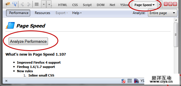 一旦你已安装这些,就准备好进行下一步了。通过火狐浏览器进入你想要优化的网站,点击添加栏中Firebug的图标(如下所示),从而打开Firebug控制台,然后点击网页的速度选项卡,其次是分析性能选项卡,在几秒钟内你会得到一个100以外的分数。这样做的目的是,获得一个分数使其越接近100越好。而之前你的分数大概已经在70/80周围。