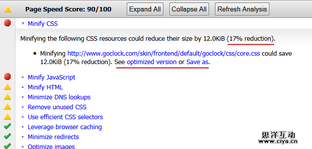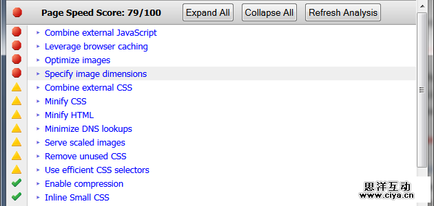 Page Speed插件的便捷之处在于,如果你点击进入某个区域,它将给你提供额外的信息,而且此区域会以不同颜色的编码来指示其好坏,红色代表很差,黄色代表还好,绿色代表非常好。
