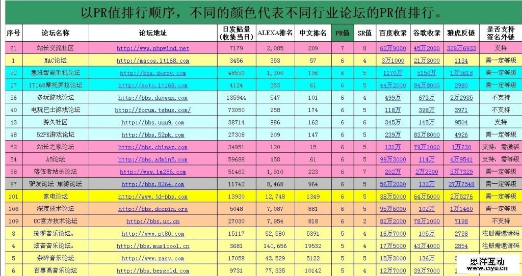 之前收集的数据对我们有没有用处,就在分析里可以看的出来。不同的数据分析,代表着各个行业的需求。既然是用于网络推广的资源,我就选了Alexa排名,中文排名,PR值, SR值,百度收录,谷歌收录,雅虎反链进行了分析。选用了站长工具进行数据分析。其中最重要的就是论坛中是否可签名外链,这点是每个推广人员最重要的资源之一。虽然在这点数据分析上花的时间比较多,但是这个是非常有用的,一眼就能够看出哪些论坛是自己需要的。(如图2)