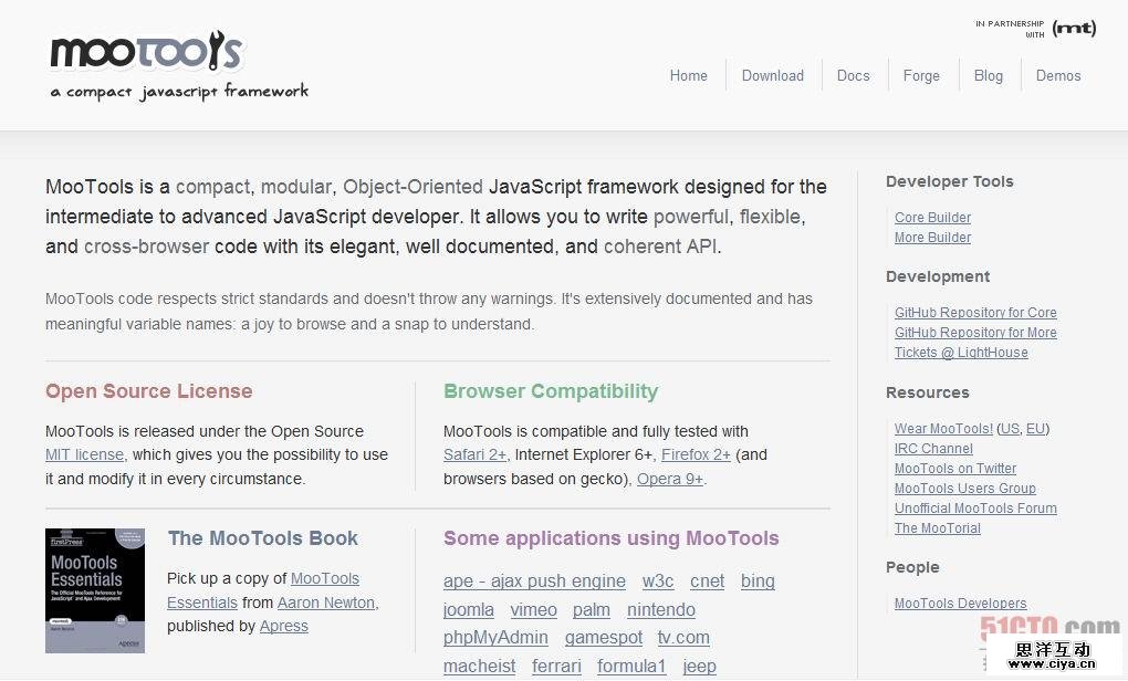 Mootools(http://mootools.net)是一个简洁、模块化、面向对象的JavaScript框架。它能够更快、更简单地编写可扩展和兼容性强的JavaScript代码。Mootools从Prototype中汲取了许多有益的设计理念,其语法与Prototype极其类似,但它提供的功能要比Prototype多,整体设计也比Prototype要相对完善,功能更强大,它增加了动画特效、拖放操作等功能。其官网如图1.5所示。