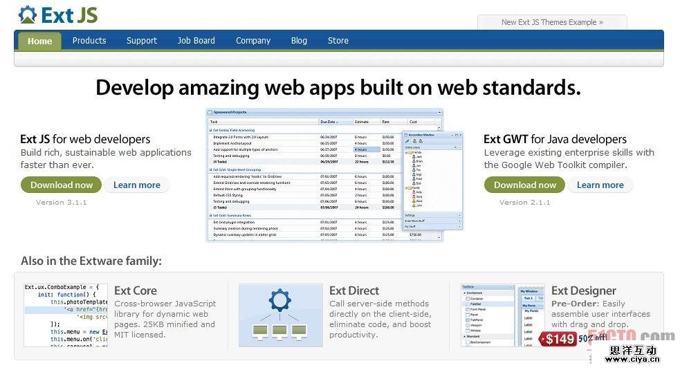ExtJS(http://www.extjs.com)是一个跨浏览器,用于开发RIA(Rich Internet Application)应用的JavaScript框架,它提供高性能、可定制的Web UI控件库。该框架具有良好的设计、丰富的文档和可扩展的组件模型,其官网如图1.8所示。