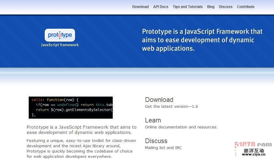Prototype(http://www.prototypejs.org)是一个易于使用、面向对象的JavaScript框架。它封装并简化和扩展一些在Web开发过程中常用到的JavaScript方法与Ajax交互处理过程,其官网如图1.6所示。