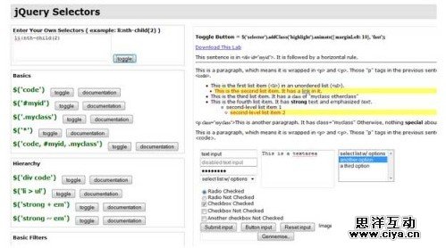 这个jQuery选择器实验室非常酷,它能在线免费使用,当然你也能下来到本地离线使用。这个测试页面包含复杂的HTML组合字段,然后你能尝试预定义使用各种jQuery选择器。如果这还不够你也可以自定义选择器。