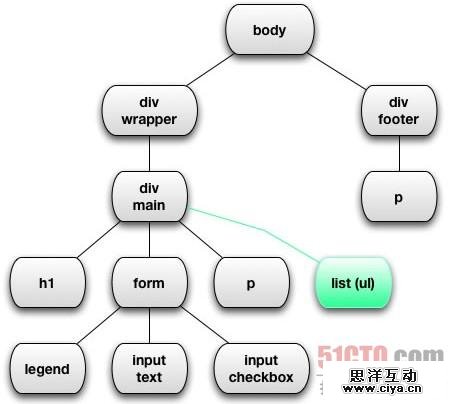 就想树一样,网站结构中叶存在子与父。在jQuery中,我们可以利用这一结构。假设我们拥有相同的html,但是现在我们想要选择名为“main”的div中的p元素,但是不想对任何有关p元素的东西造成变化。
