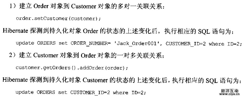 类类之间建立了联系,就可以很方便地从一个对象导航到另一个或者另一组与它相关联的对象。正如上例中,对于给定的Order对象,如果想获得与之关联的Customer对象,可以直接如下调用: