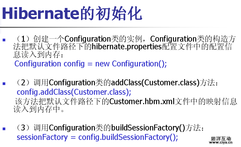 - /** 初始化Hibernate,创建SessionFactory实例 */