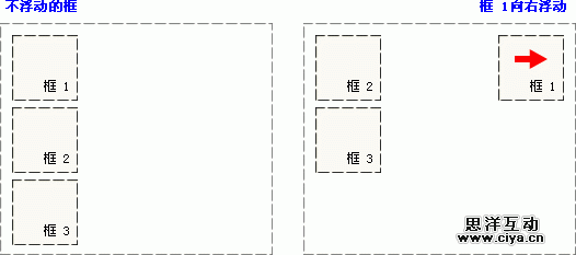 请看下图,当把框1向右浮动时,它脱离文档流并且向右移动,直到它的右边缘碰到包含框的右边缘: