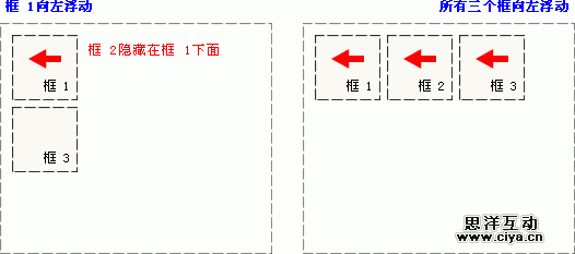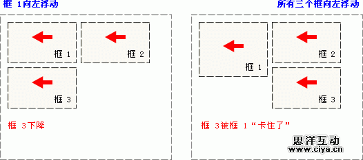 如果把所有三个框都向左移动,那么框1向左浮动直到碰到包含框,另外两个框向左浮动直到碰到前一个浮动框。