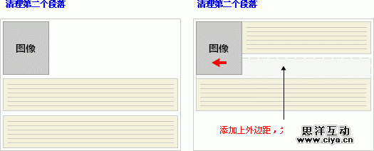 为了实现这种效果,在被清理的元素的上外边距上添加足够的空间,使元素的顶边缘垂直下降到浮动框下面: