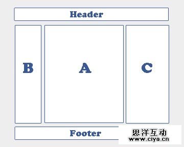 但是,我们常用的布局并没有这么简单,除了三栏之外,我们还需要一个页头和一个页脚,如下图: