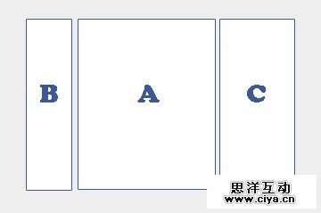 这是一个三栏的布局,并且是居中显示的。其中,A栏是主体内容栏,B栏和C栏都是侧边栏。首先,我们不可能直接用绝对定位将A、B、C三栏定位到居中的位置,因为每个人显示器的分辨率是不同的,在1024X768分辨率的显示器上定位的居中效果,在别的分辨率的显示器上看到的效果肯定不会是居中显示的,那么,该如何解决这个问题呢?