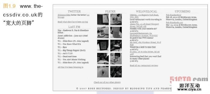你可能会像www.thecssdiv.co.uk那样拥有一个时髦的“宽大的页脚”(如图1.9所示)。
