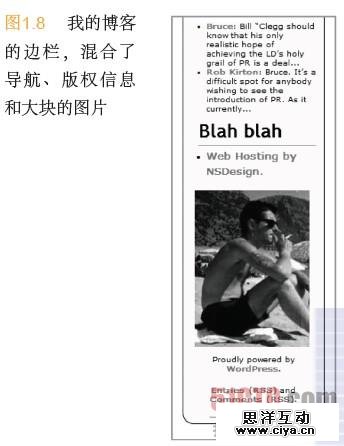 很多站点都有一个边栏,其中包含多个导航块以及其他的非导航内容。例如,我的个人站点www.brucelawson.co.uk,如图1.8所示。