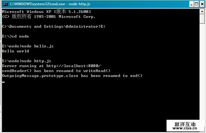 然后我们在命名台中输入命令node http.js,在浏览器输入http://localhost:8080/