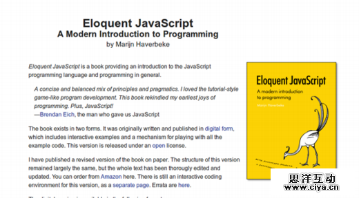 这个免费的电子书介绍如何开发javascript语言,由开发者兼作者Marjin Haverbeke完成。这本书类似一个教程,使用简单清楚的方式介绍了很多概念和现实的程序。同时也有互动的例子,这些例子可以了解很多开发技巧。我们发现很多人对于这本书都有正面评论,因此如果你是新手,GBin1这里绝对推荐你乐队一下。