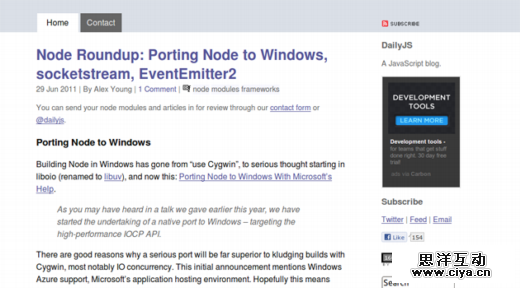 我们看过了一些不错得工具和参考资料,包括客户端和服务器端的教程和框架。如果我们需要更多新鲜的内容呢?DailyJS是一个非常流行的javascrip博客能够带给你最新最伟大的javascript新闻,提示和技巧。并且介绍讨论javascript类库,插件和服务。如果你需要每天都了解javascript的精华消息,DailyJS绝对是你的首选。