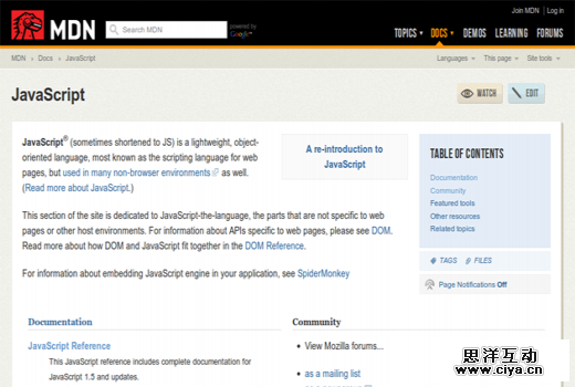 MDN已经成为事实上javascript文档资源库,对于初学者和老手来说都是不错学习资源。这里你可以找到官方的完整的javascript参考,还有许多有用的指导,教程以及文章,从基本javascript使用到最佳实践以及设计模式,样样俱全。MDN同时也拥有完成的DOM参考,GBin1强烈推荐看看这些。