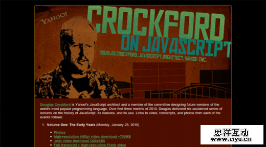 道格拉斯,无可质疑的Javascript专家,是yahoo的javascript架构师并且是独立计划,开发和促进javascript语言发展的人物之一。这些YUI上的视频和笔录来自于道格拉斯的一系列关于javascript的访谈,包括未来和现在我们正在使用中的技术。虽然有一年半没有更新了,还是值得大家去关注。GBin1推荐观看一下视频,以便于更好的了解这种语言。 GBin1提示:要求您的外语水平,稍微有些英文听力要求。