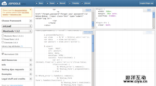JS Fiddle是一个JS在线调试工具,这个工具适合在线合作调试和分享代码片段。同时也是个有趣的方式来测试新的想法。简单的组合CSS,JS,HTML,然后点击RUN就能看到结果。还可以使用JSLint来验证代码争取性,并且能够保存,以方便分享给其它人。JS Fiddle提供了方便加载各种javascript类库的机制,你可以方便的选择类库加载。而且支持语法高亮,就像使用IDE来开发javascript代码。