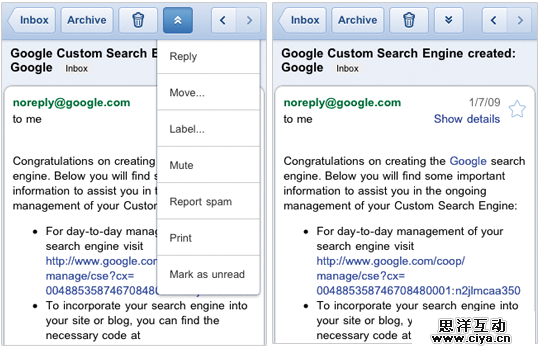 图4.11:在Gmail移动Web应用中关联动作选项(Contextual actions)可以让人们迅速对他们的邮件进行操作