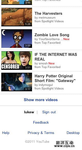 图4.8:在YouTube的移动Web应用的页面底端的选项基本上是走向了一条死胡同。退出登录(Sign out)?还是发送反馈(Feedback)?