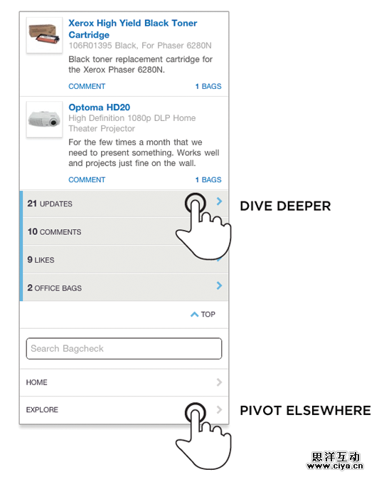 图4.10:Bagcheck手机Web应用中的基于关联导航菜单(Contextual navigation menu)可以让人们进一步搜索相关内容关联导航选项(Contextual navigation options)对任务来说是很有用的。