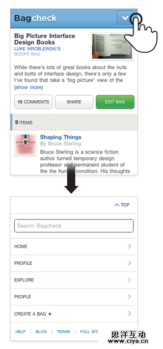 尽管底端的菜单对于人们进行进一步搜索是很有帮助的,但它们不应该与其他地方能找到的菜单相同。与此相反,一个顶端的菜单按钮应该可以将人们链到移动Web页面的底部导航菜单(在内容之后)。我们最近在Bagcheck移动Web应用使用了这种方式(图4.9)。