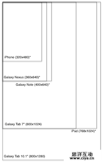 我们需要画一条线来区分屏幕大和小的触摸设备。例如像5寸Galaxy Note的边缘情况。下图显示了许多流行的Android和iOS设备轮廓(附上相应的屏幕分辨率)。星号表示该设备可以支持双倍密度。虽然像素密度可能会增加一倍,CSS仍然会报告相同的大小。