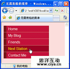 当项目列表的项目符号可以通过list-style-type设置为none时,制作各式各样的菜单、导航条成了项目列表的最大用处之一,通过各种CSS属性变幻可以达到很多意想不到的导航效果。首先看一个实例,其效果如图所示。