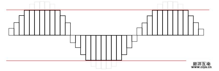 由于多种声音互相叠加起来播放,你可能会发现在某种情况下,声音超过了扬声器的最大承受能力。就像图像超出了画布边界的情况一样,声音也会在波形超过最大阈值时进行削波,导致明显的失真。波形看起来会像下面这样: