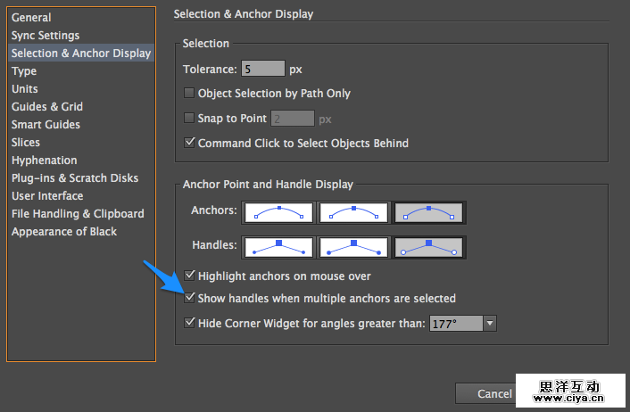 注意:要预览你自己的贝塞尔曲线——也就是钢笔轮廓,你可以打开AI的首选项进行设置( ⌘K)。这可以让你更方便控制手柄调节曲线的弧度。