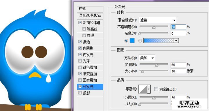 再为眼睛添加外发光样式。淡淡的外发光可以使眼睛的边缘看起来更加柔和。