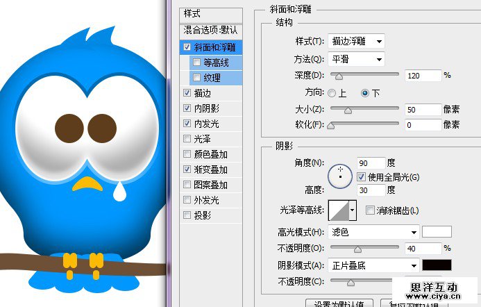 再添加斜面和浮雕样式以及描边样式,使眼睛更有立体感。