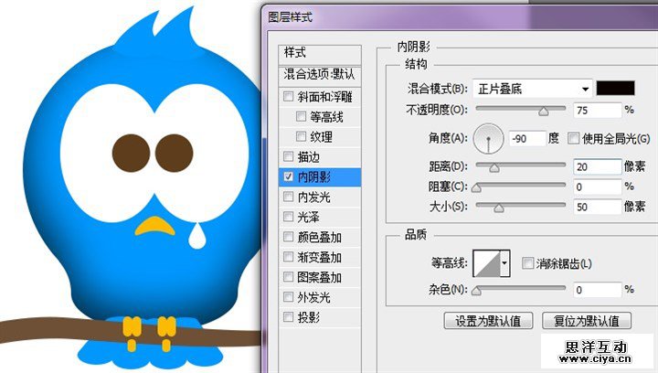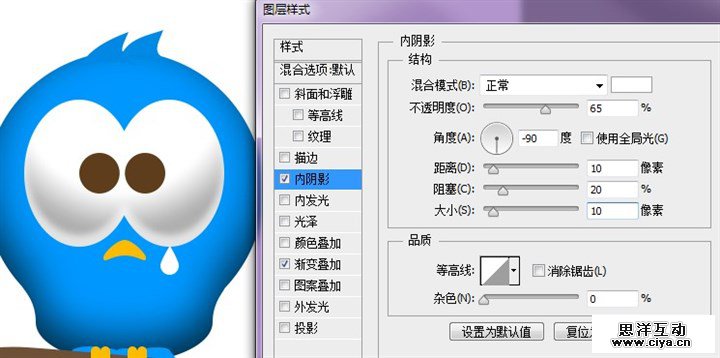 大体形状已绘制完成,接下来我们继续添加图层样式使图像更有立体感与细节。 我们首先为身体部分添加内阴影样式。参数设置如下: