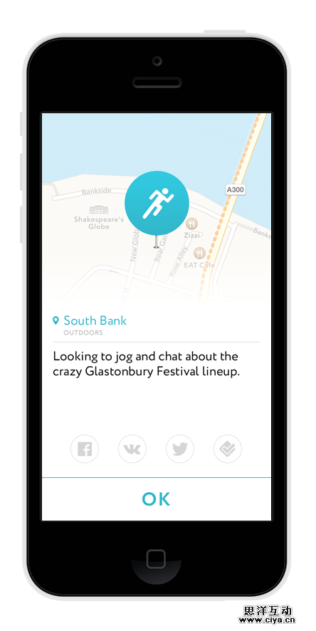 在上面的动画中,用户选择了吃饭,图标上移在地图上化作地标,这个动画非常明确的告诉用户这一活动的类型(吃饭)以及是在什么地方。当你点击OK之后,地图标记化作雷达,扫描周围50km内的用户,非常直观,不多一句话。没有多余的按钮、请求和大大小小的按钮和框图,用户只需要看着动效,就明白发生了什么。