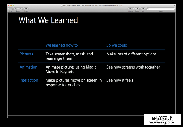 具体关于为何这么做,每个阶段完后的反馈过程,目标等等原理的东西请大家看视频或者PDF吧,这里主要说下过程和他们是怎么充分发挥Keynote在原型制作中的特点的。
