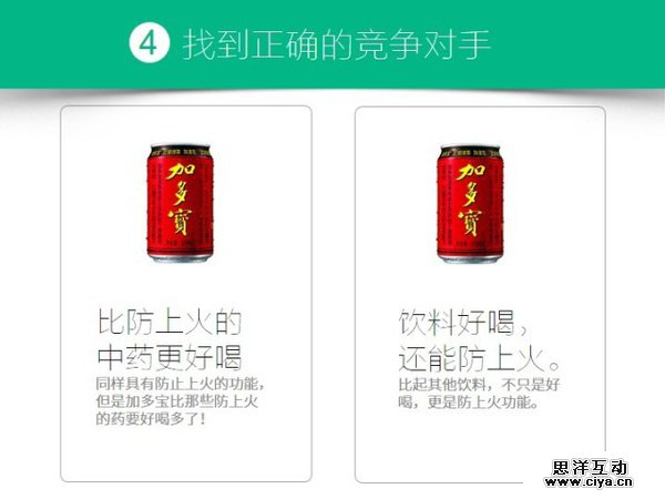 比如上图中,我假想的上述两种加多宝凉茶的文案,前一种是跟预防上火的中药比,虽然更加突出了“防上火”功能,但是人觉得“是药三分毒”,可能不敢喝;后者跟饮料比,增加了“防上火”功能,给人感觉“不再为喝不健康饮料而有负罪感”了。