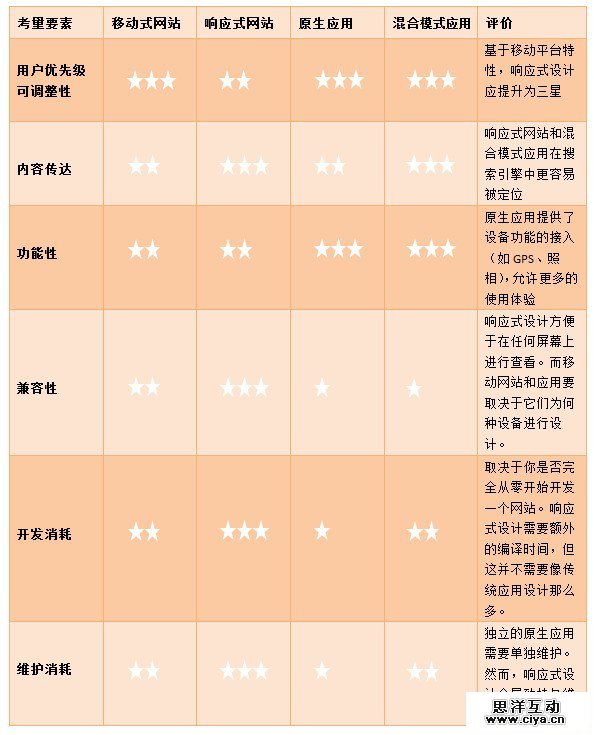 不同于传统网站,移动设计的实现存在四种主流方式。移动用户最希望在浏览器上浏览,移动式网站(为移动设备而特地优化的网站)或者响应式网站(根据设备重新排列布局的网站)的内容。而那些在设备上安装了应用程序的人会选择原生应用或混合模式应用。原生应用是独立存在的:每一个应用的界面都被定义在平台层上方。混合模式应用提供了更为灵活的方式,从网络中获取内容,(即通过浏览器进行阅读),但也提供了类似于原生应用的界面。