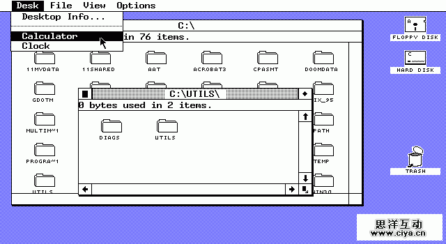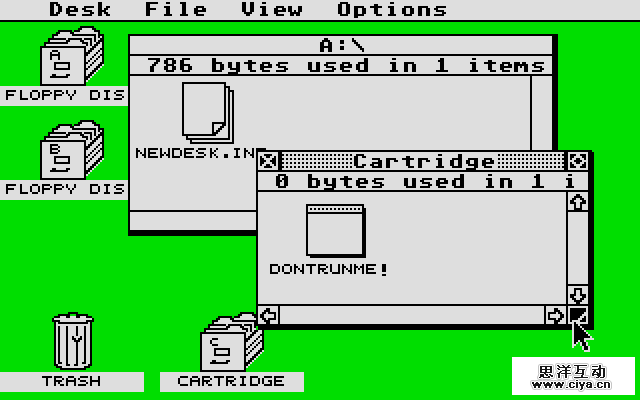 这是源自Atari TOS 1.0的截图。1985年,当GEM系统被移植到到Atari ST上成为Atari分支的时候,最早的[x]关闭按钮在这里被发现。为什么是这个时候,在这个地方?