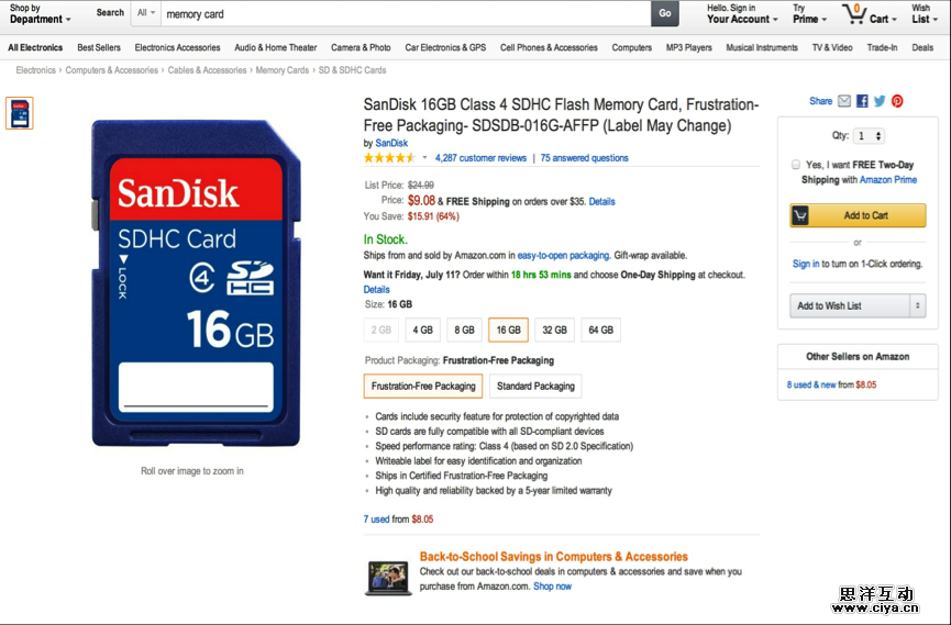 如果你在亚马逊搜索“存储卡”,选择被置顶的产品条目之后,你可以看到一个截然不同的页面。在你滚动到下方长长的用户评论之前,你会注意到这款产品低廉的价格、简短精悍的产品描述,简单的物流选项,这些信息基本就能让消费者作出决定。