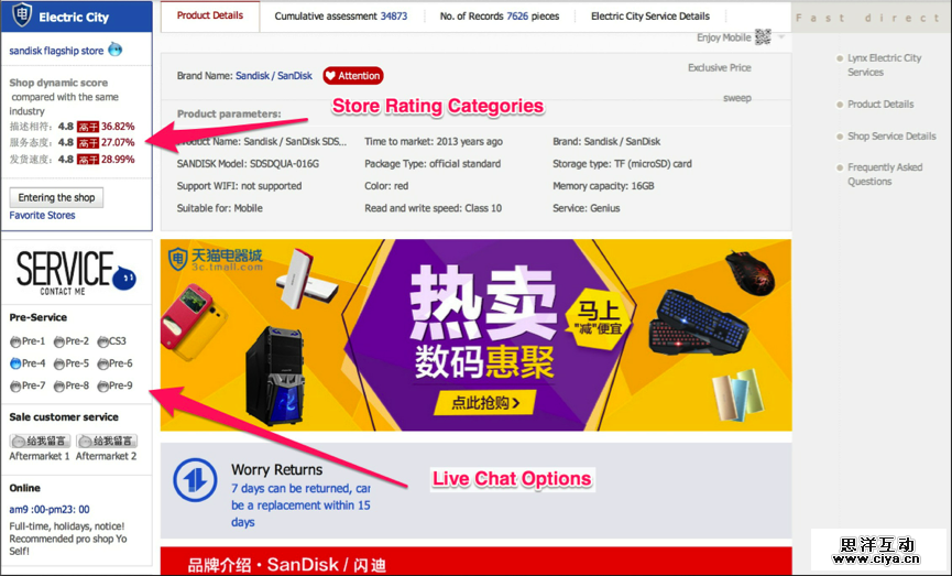 但是同样在天猫搜索产品之后,你会发现这里的商家提供给消费者的信息量简直能让亚马逊无地自容。页面顶端提供的基本信息和亚马逊差别不大,但是下面就大不相同了: