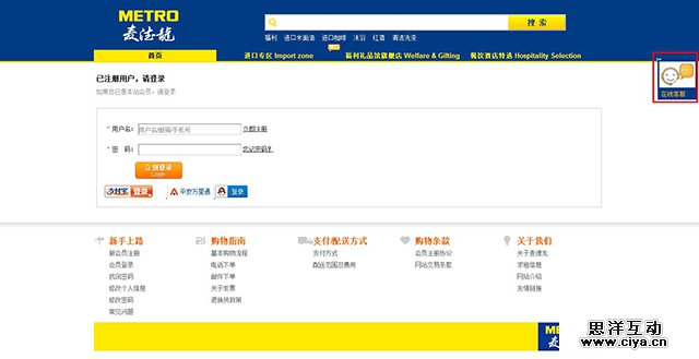 在线客服的功能很多网站都有,但在登陆页出现的却不多见。在登录或注册的过程中,其实用户很容易遇到困难,在麦德龙的登陆页中就很贴心的设置了这一功能,并且实现动态效果,让用户在有需要的时候马上找到它。